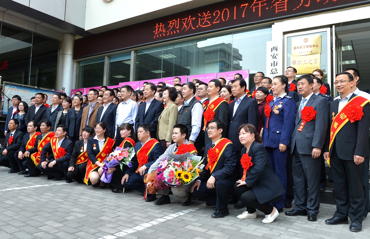 4月27日下昼,,,,,,,,西安市总工会前彩旗飘飘,,,,,,,,锣鼓喧天,,,,,,,,“向劳模学习,,,,,,,,向劳模致敬”“弘扬劳模精神,,,,,,,,奋力追赶逾越”的横幅和象征着荣光的彩绸红花悬挂在欢送劳模的车辆两侧,,,,,,,,陕西省劳模西安市代表团欢送仪式正在这里举行。。。。。。市总工会主席史南征、副主席童帅等出席欢送仪式并讲话。。。。。。